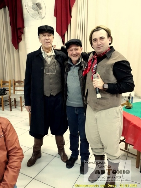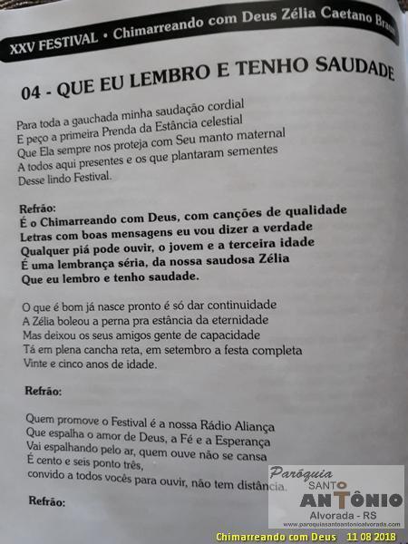 Mais uma vez a Comunidade da Paróquia Anto Antonio de Alvorada se fez presente no Chimarreando com Deus. Desta vez através da pessoa do Sr. Miguel Volmar. Fica aqui os parabéns a este ilustre Paroquiano. Ficou em primeiro lugar a letras da musica apresentada no 25º Festival Chimarreando com Deus que aconteceu no dia 11 de agosto no santuário São Cristóvão em Canoas.