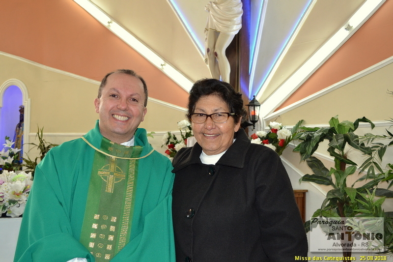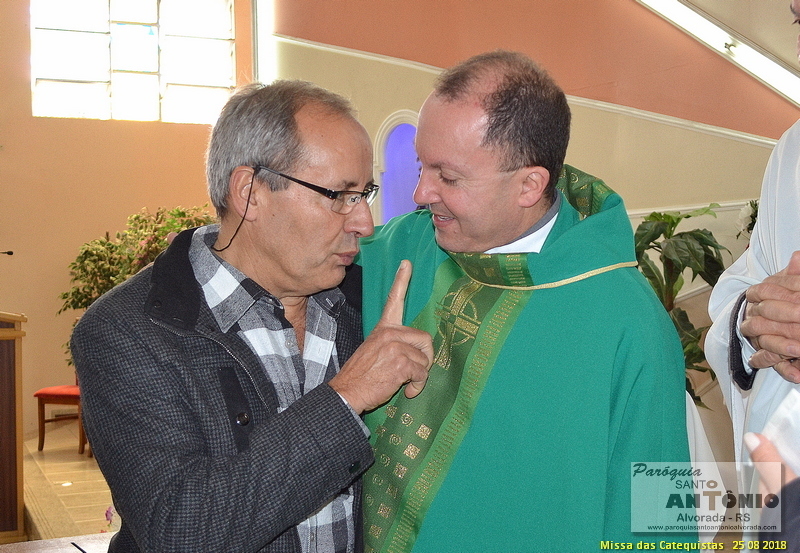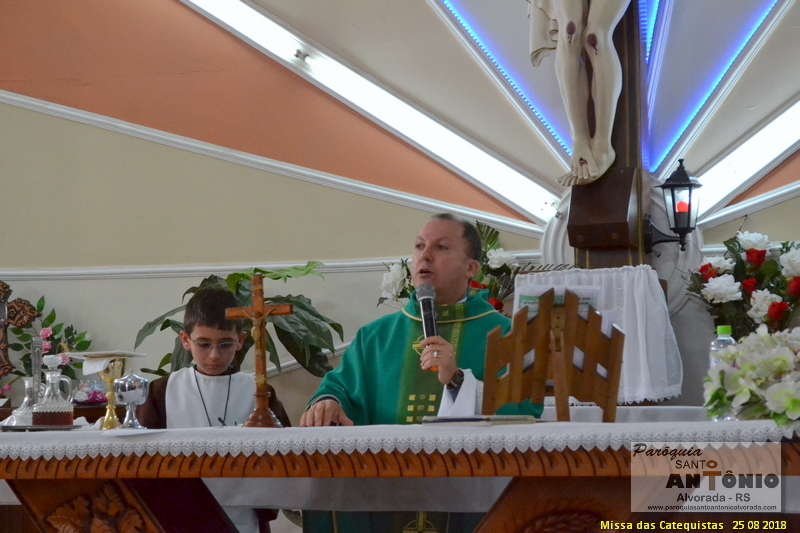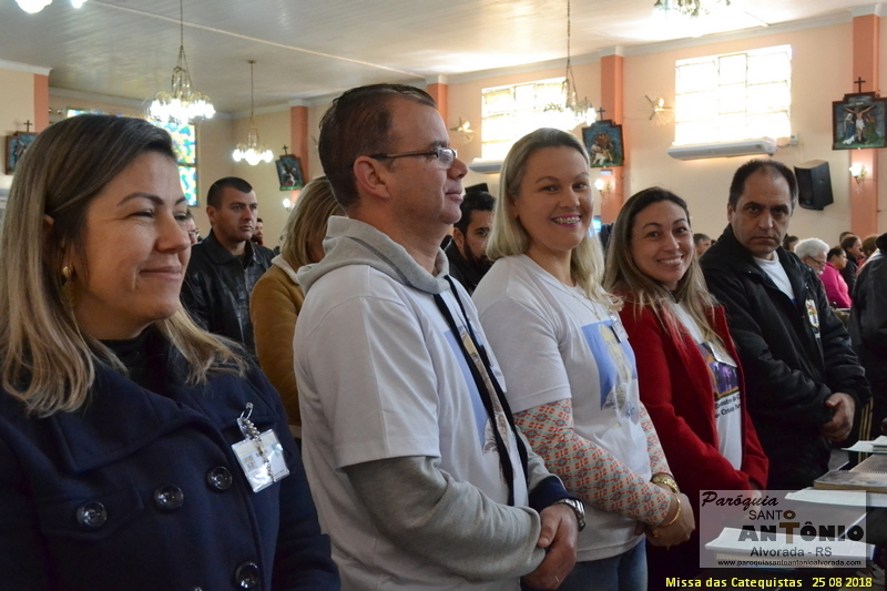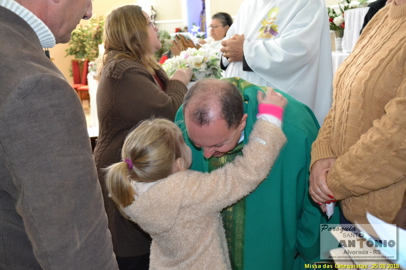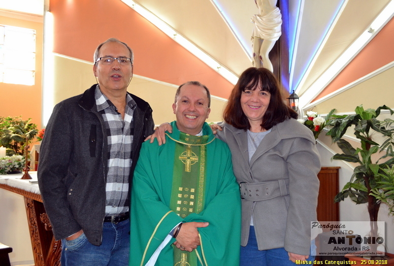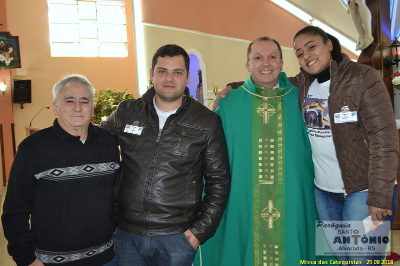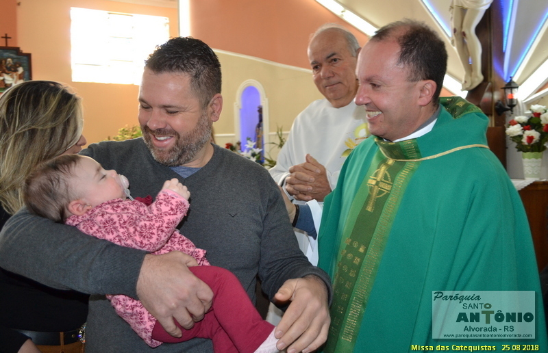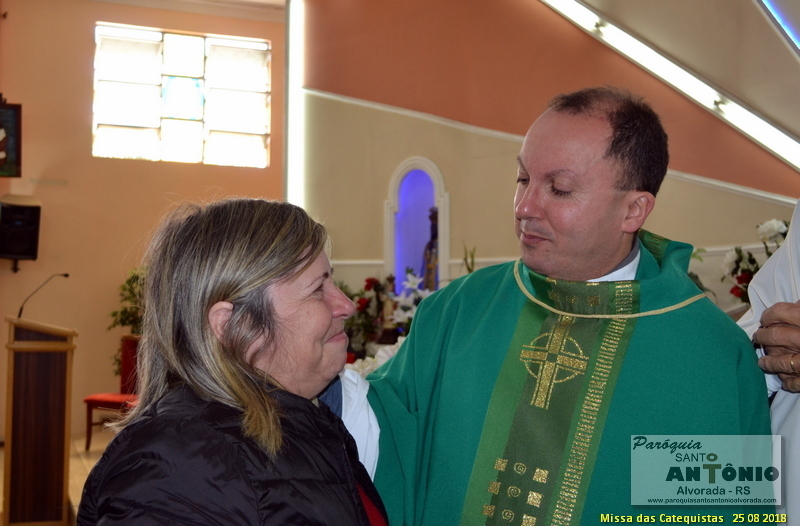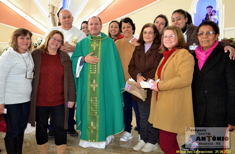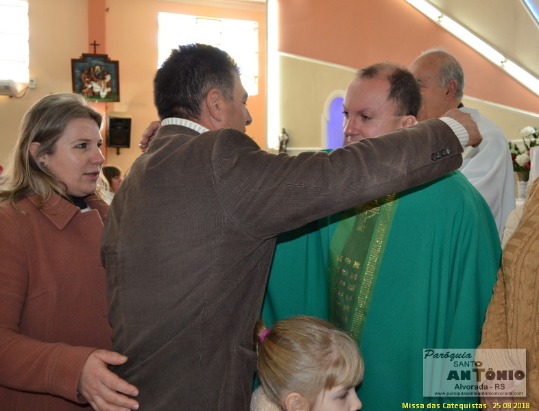 No ultimo domingo de agosto na Missa das 9,30 horas,na Paróquia Santo Antonio de Alvorada, a qual foi ministrada pelo Padre Rogério Ferraz, foram homenageados os Catequistas pela passagem de seu dia. A Coordenadora da Catequese da Primeira Eucaristia da Paróquia a Sra. Suzana Zarbato leu uma mensagem e distribuiu uma pequena lembrança pela passagem do dia dos Catequistas. Foram homenageados os Catequistas presente; da primeira Eucaristia, do Crisma ,do Batismo e do Crisma dos adultos. Neste dia foram apesentadas as crianças que serão batizadas no próximo sábado. Na ocasião o Padre Rogério comunicou sua transferência para a Paróquia Santa Luzia e Santa Rita localizadas na Zona Sul de Porto Alegre. Sendo assim após a benção final a comunidade presente emocionada e triste se despediu individualmente do Padre Rogério.