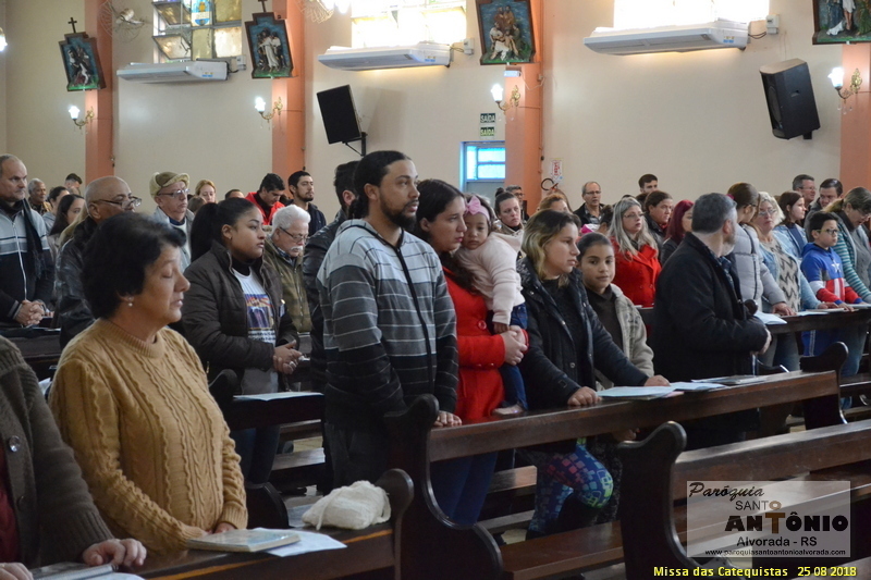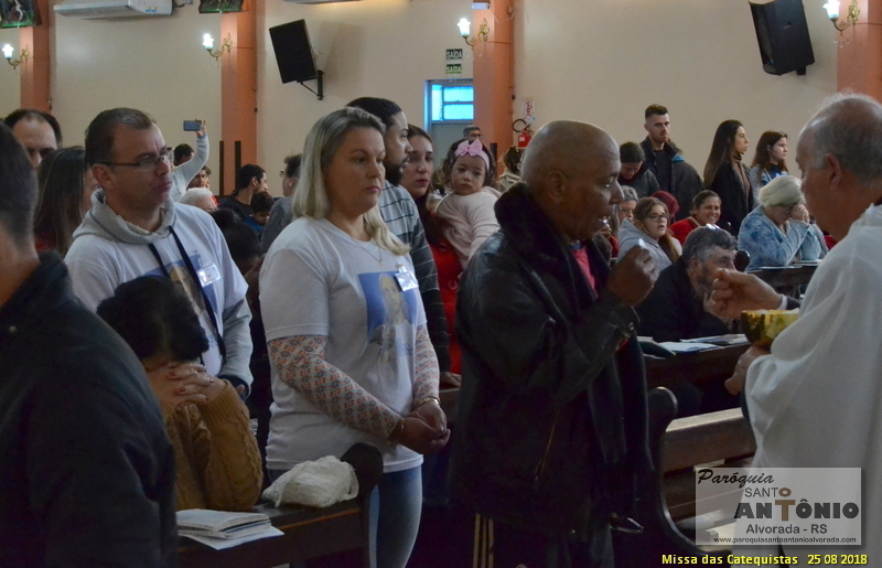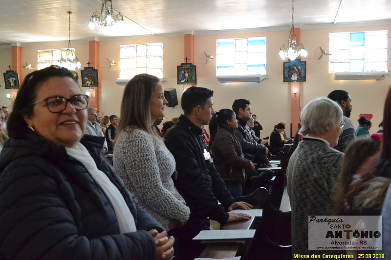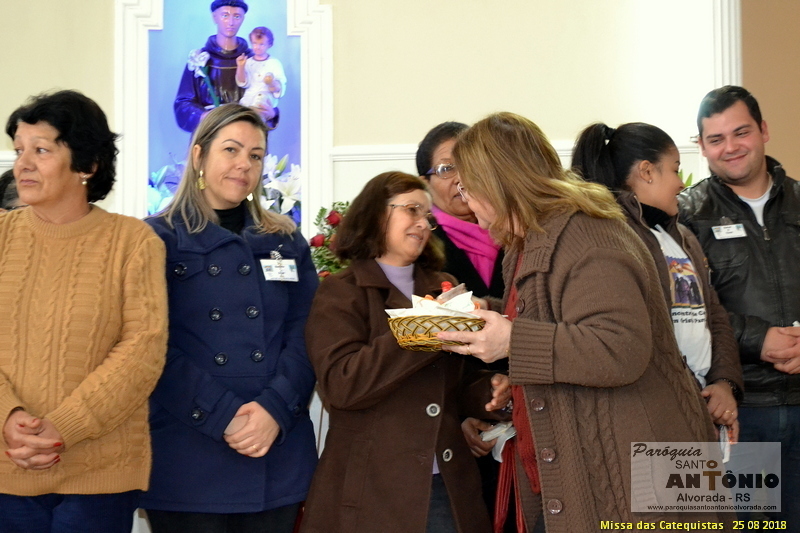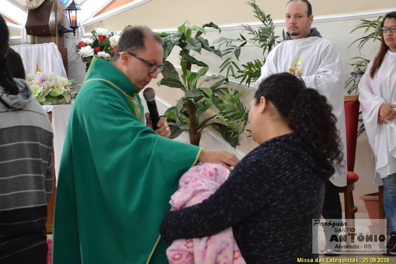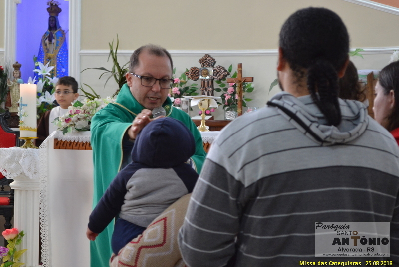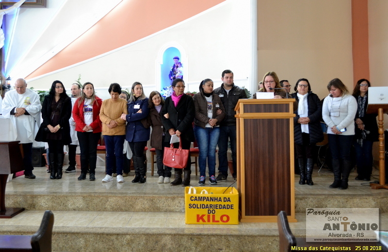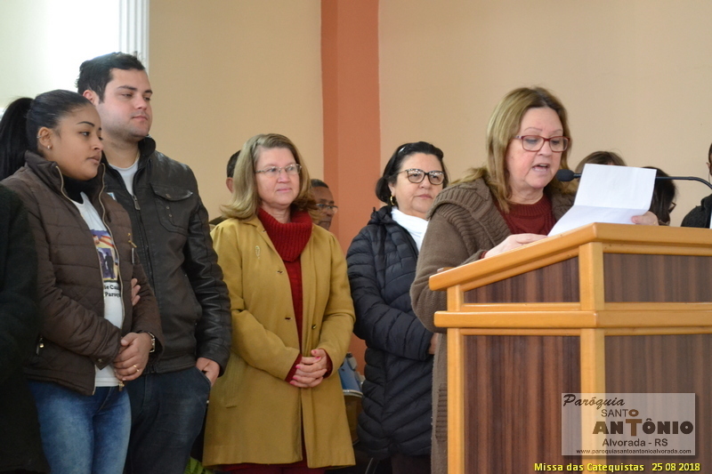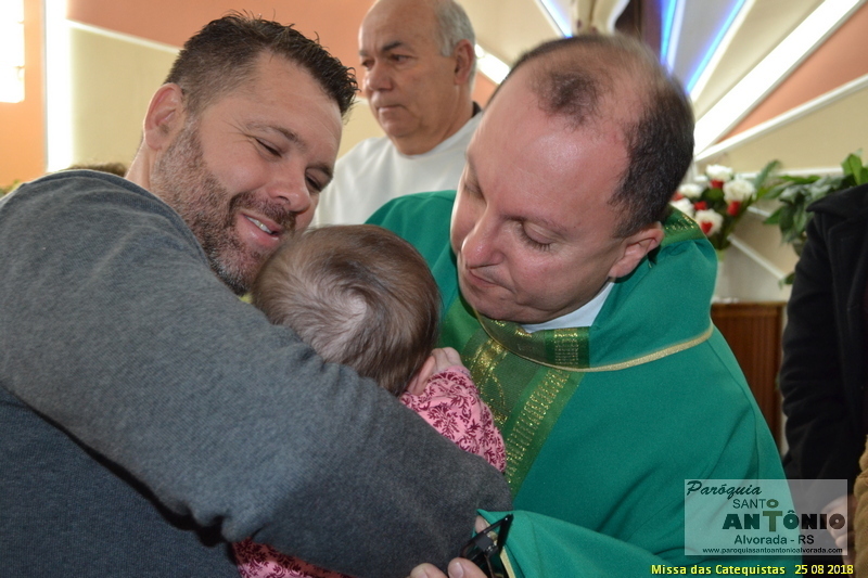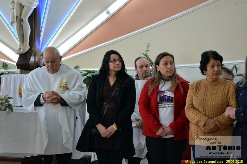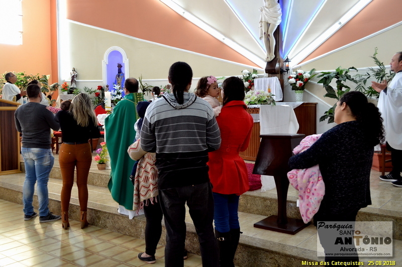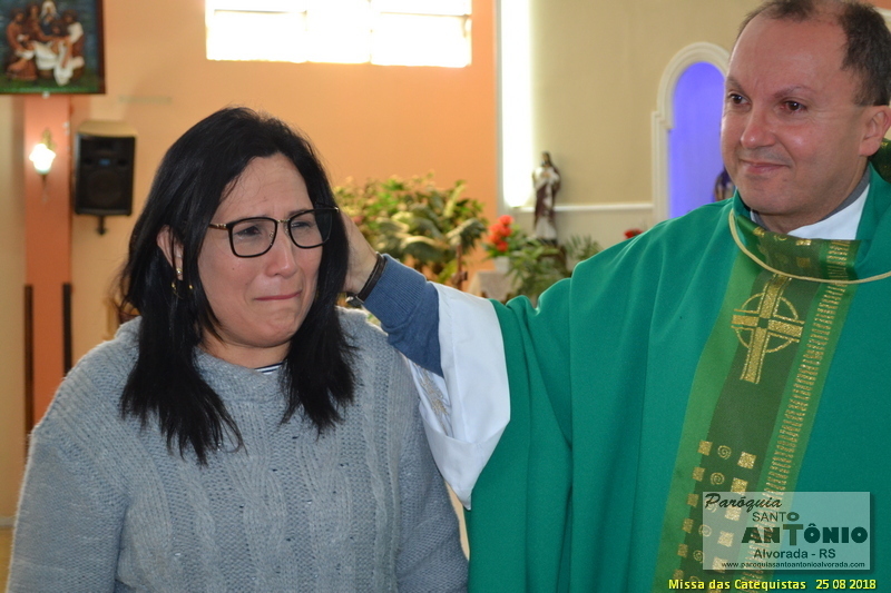 No ultimo domingo de agosto na Missa das 9,30 horas,na Paróquia Santo Antonio de Alvorada, a qual foi ministrada pelo Padre Rogério Ferraz, foram homenageados os Catequistas pela passagem de seu dia. A Coordenadora da Catequese da Primeira Eucaristia da Paróquia a Sra. Suzana Zarbato leu uma mensagem e distribuiu uma pequena lembrança pela passagem do dia dos Catequistas. Foram homenageados os Catequistas presente; da primeira Eucaristia, do Crisma ,do Batismo e do Crisma dos adultos. Neste dia foram apesentadas as crianças que serão batizadas no próximo sábado. Na ocasião o Padre Rogério comunicou sua transferência para a Paróquia Santa Luzia e Santa Rita localizadas na Zona Sul de Porto Alegre. Sendo assim após a benção final a comunidade presente emocionada e triste se despediu individualmente do Padre Rogério.
