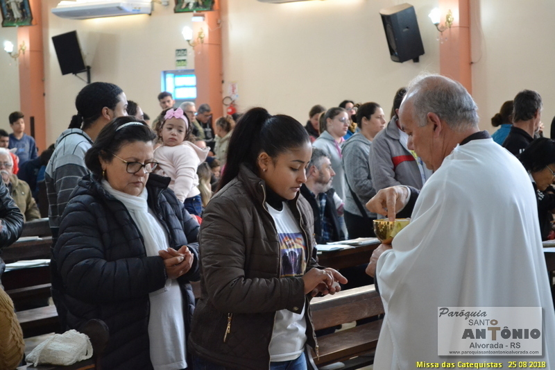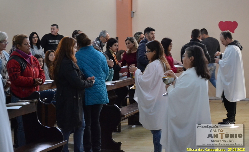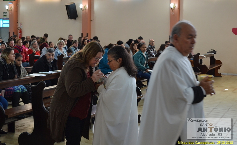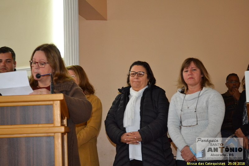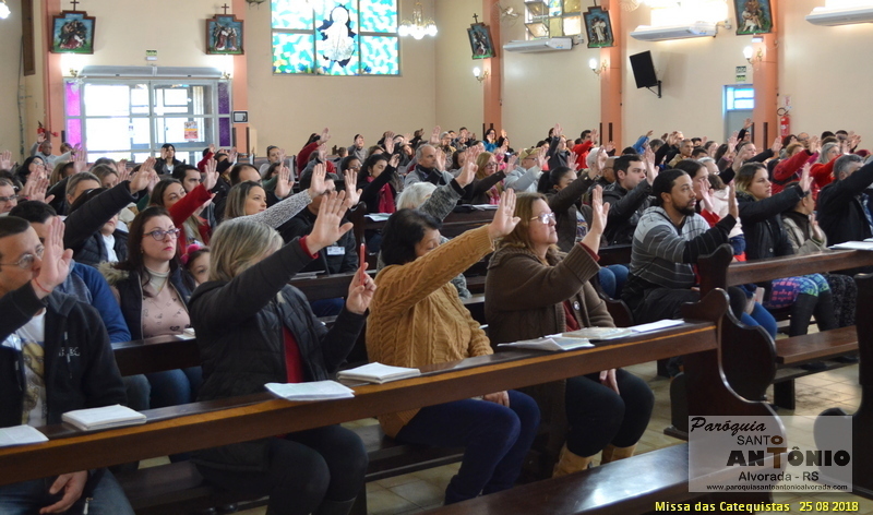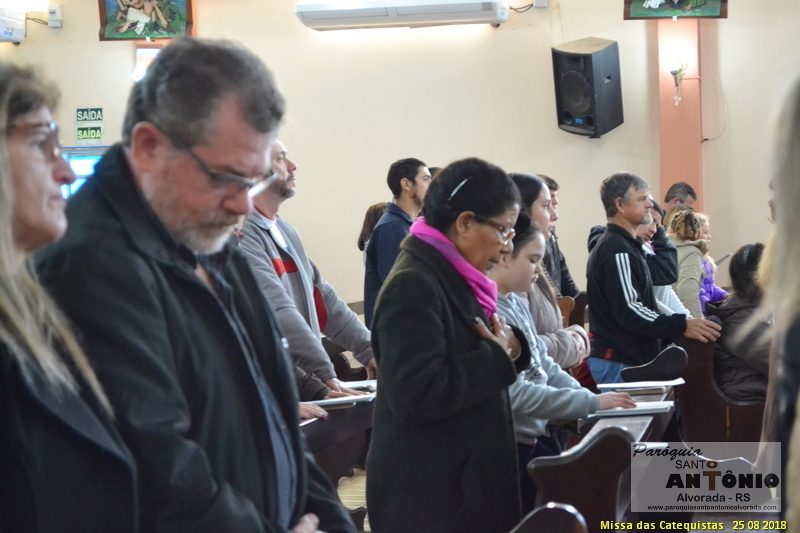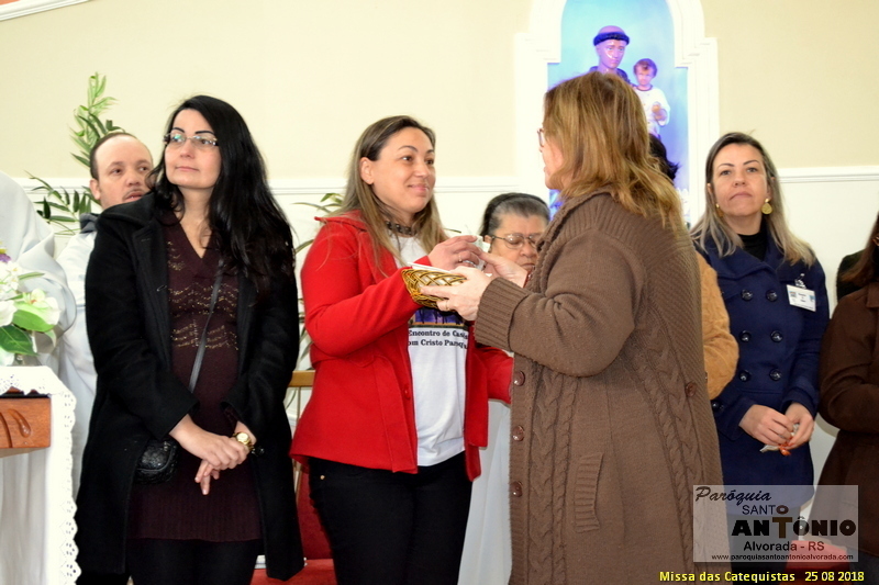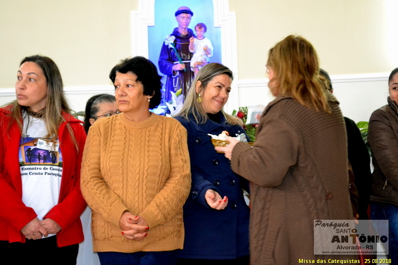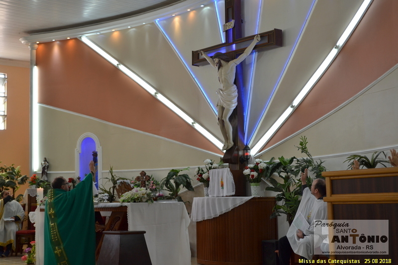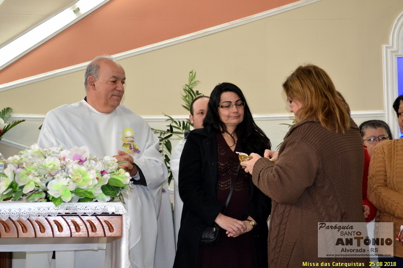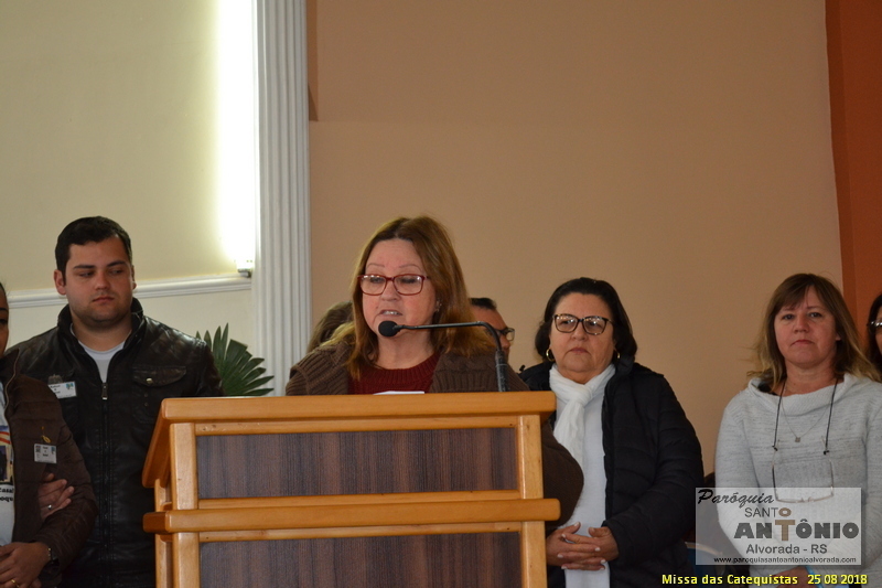 No ultimo domingo de agosto na Missa das 9,30 horas,na Paróquia Santo Antonio de Alvorada, a qual foi ministrada pelo Padre Rogério Ferraz, foram homenageados os Catequistas pela passagem de seu dia. A Coordenadora da Catequese da Primeira Eucaristia da Paróquia a Sra. Suzana Zarbato leu uma mensagem e distribuiu uma pequena lembrança pela passagem do dia dos Catequistas. Foram homenageados os Catequistas presente; da primeira Eucaristia, do Crisma ,do Batismo e do Crisma dos adultos. Neste dia foram apesentadas as crianças que serão batizadas no próximo sábado. Na ocasião o Padre Rogério comunicou sua transferência para a Paróquia Santa Luzia e Santa Rita localizadas na Zona Sul de Porto Alegre. Sendo assim após a benção final a comunidade presente emocionada e triste se despediu individualmente do Padre Rogério.