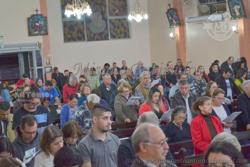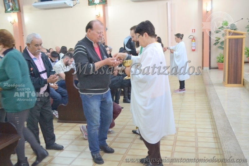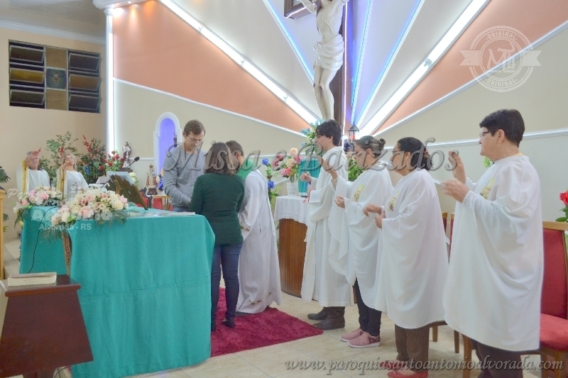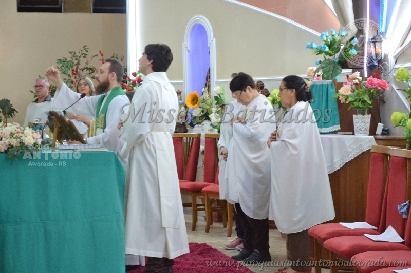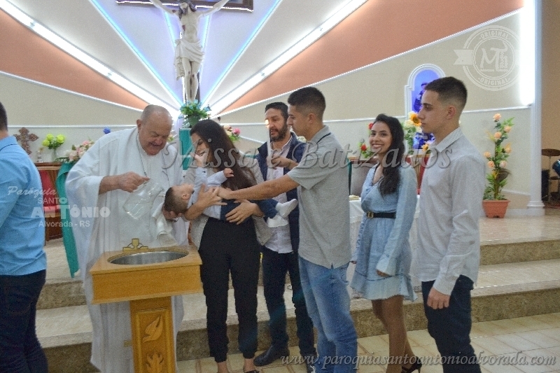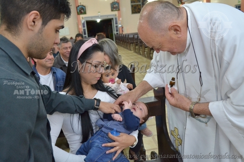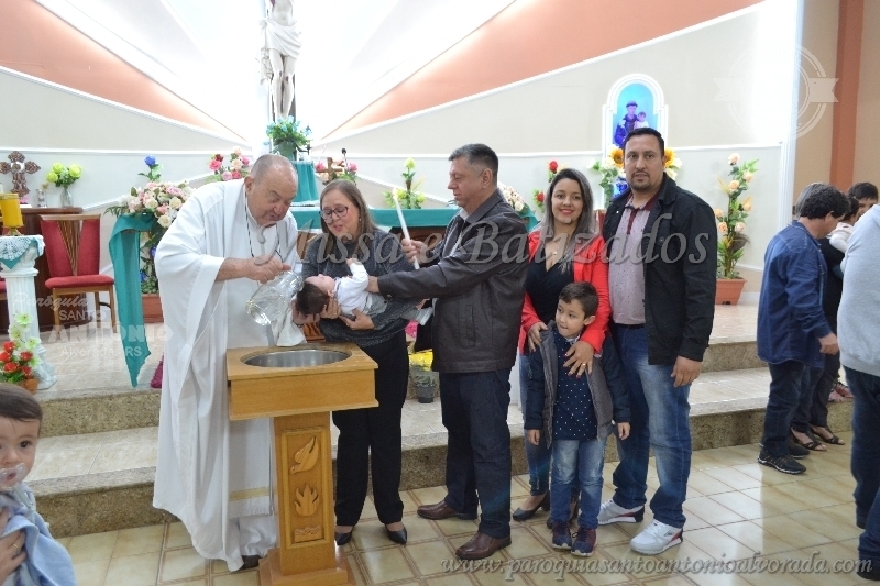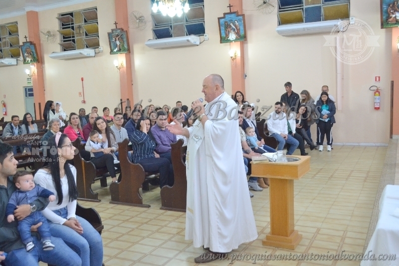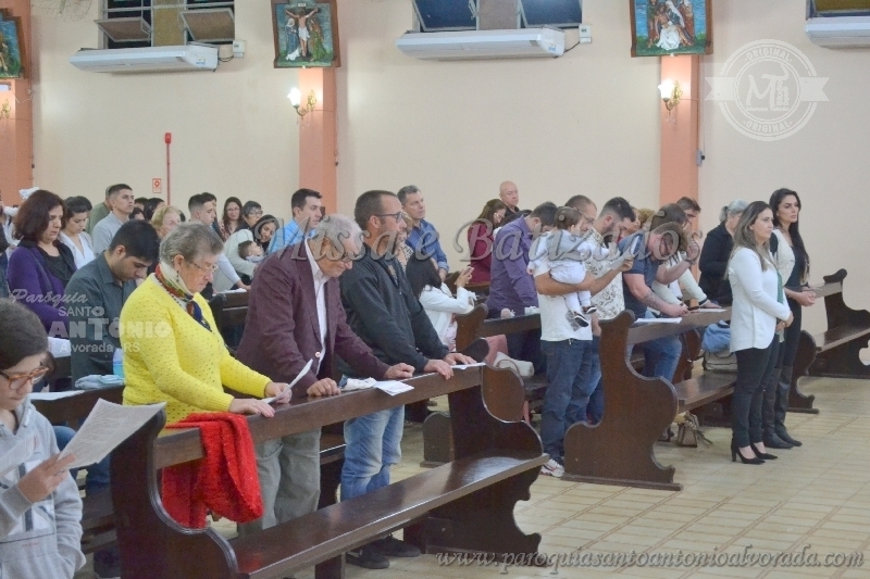 Nesta Missa o casal Adriano e Marcia tiveram suas alianças abençoadas por ocasião de mais um ano de enlace matrimonial pelo Padre Maico. logo após o Padre Libanor realizou os Batizados a mais um grupo de crianças.